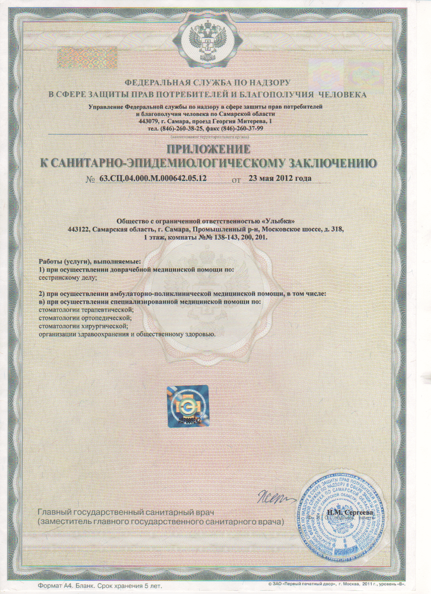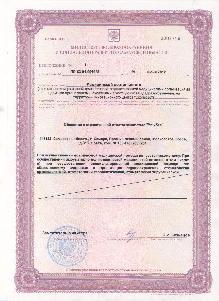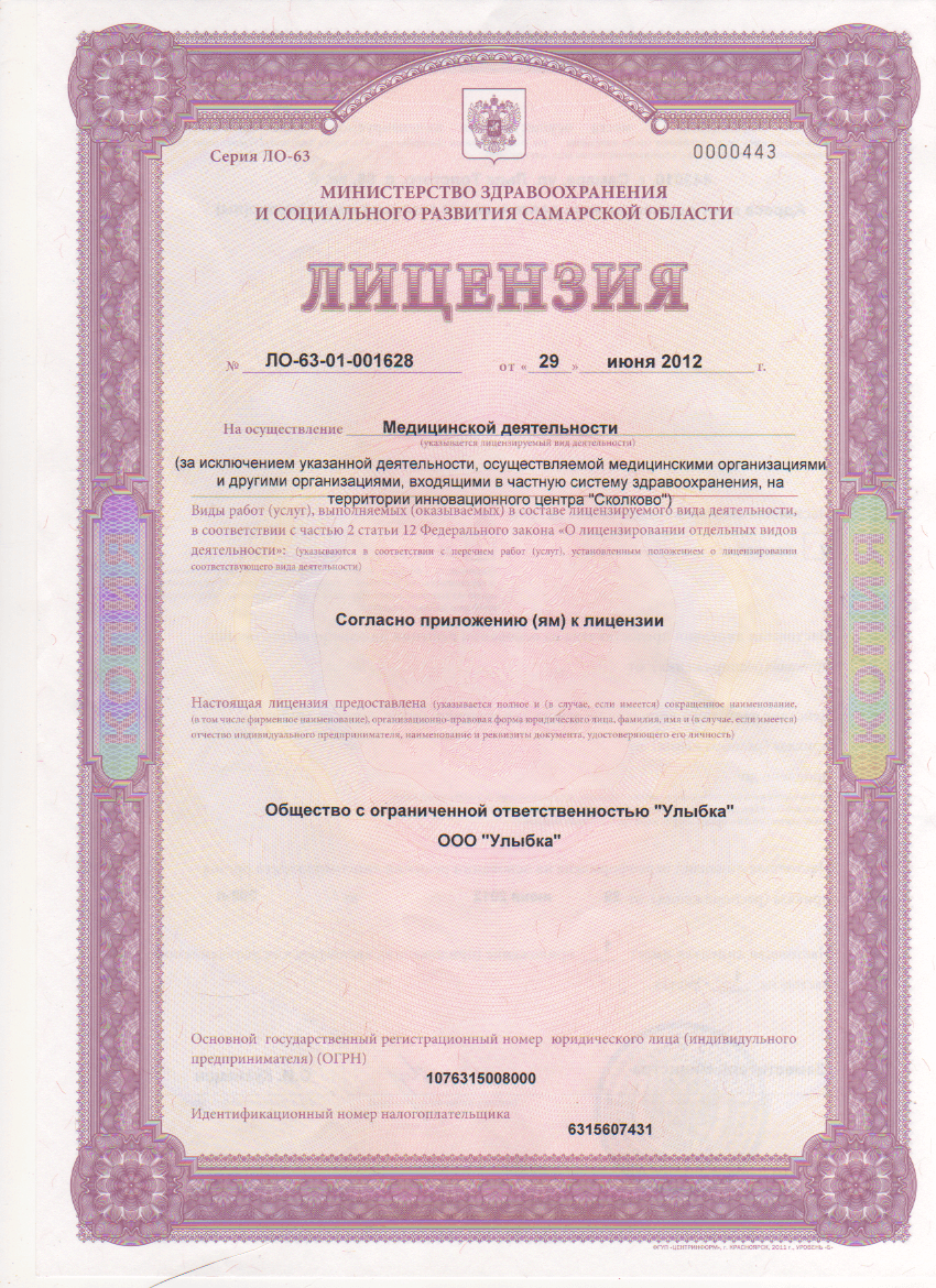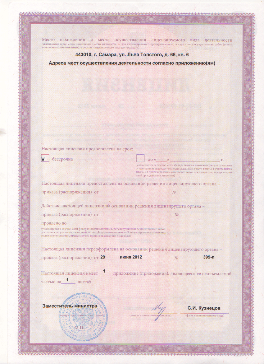 Лицензия на осуществление медицинской деятельности, выдана Министерством здравоохранения Самарской области (сканы лицензии — см. ниже на этой странице)